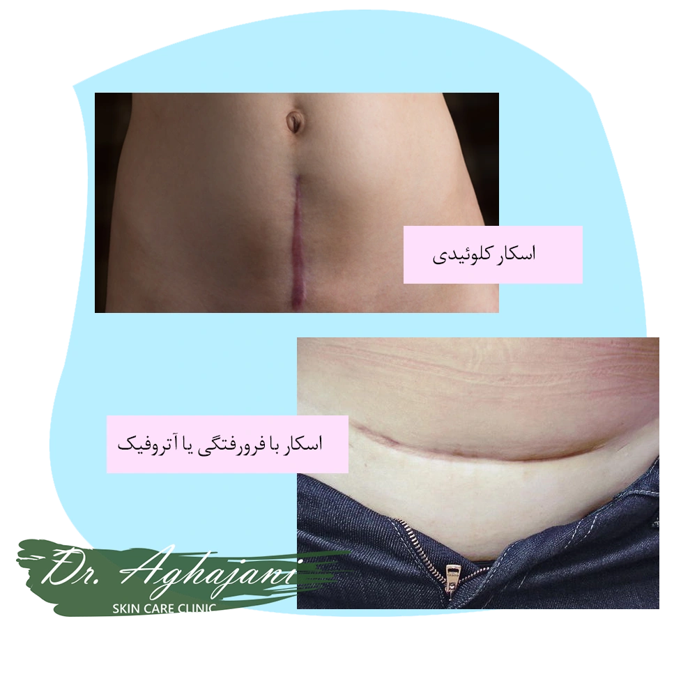 • نوع پوست: پوست‌های تیره‌تر مستعد تشکیل اسکارهای کلوئیدی یا هیپرتروفیک هستند. پوست‌های روشن‌تر معمولاً اسکارهای نازک‌تر یا فرورفته دارند.