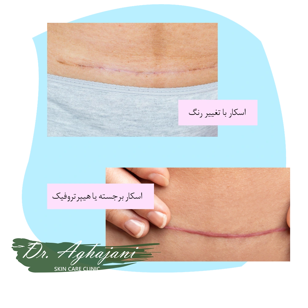 • اسکار هیپرتروفیک:  جای زخم برجسته و ضخیم‌شده است، اما محدود به ناحیه برش باقی می‌ماند.