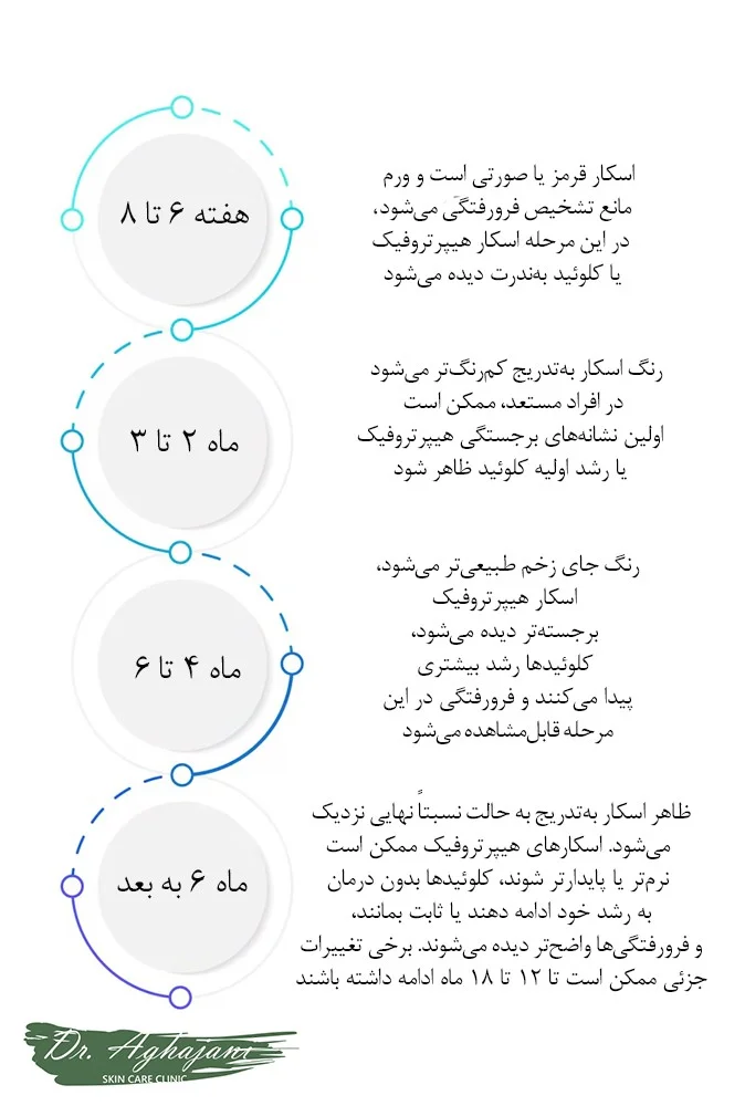 اسکار هیپرتروفیک ناشی از سزارین معمولاً طی ۶ تا ۱۲ هفته پس از جراحی، به‌تدریج برجسته و سفت می‌شود و بین ماه‌های ۳ تا ۶ به بیشترین میزان ضخامت و قرمزی خود می‌رسد. در بازه زمانی ۶ تا ۱۸ ماه، با مراقبت مناسب ممکن است کمی صاف‌تر و کم‌رنگ‌تر شود، اما معمولاً درجاتی از برجستگی و تغییر رنگ—به‌ویژه در پوست‌های تیره‌تر—باقی می‌ماند.