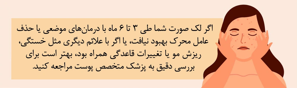 🩺 در مواردی که لک با عواملی چون کمبودهای تغذیهای، اختلالات هورمونی یا عوارض دارویی مرتبط باشد، کنترل یا حذف این علتها میتواند به بهبود پایدار کمک کند.